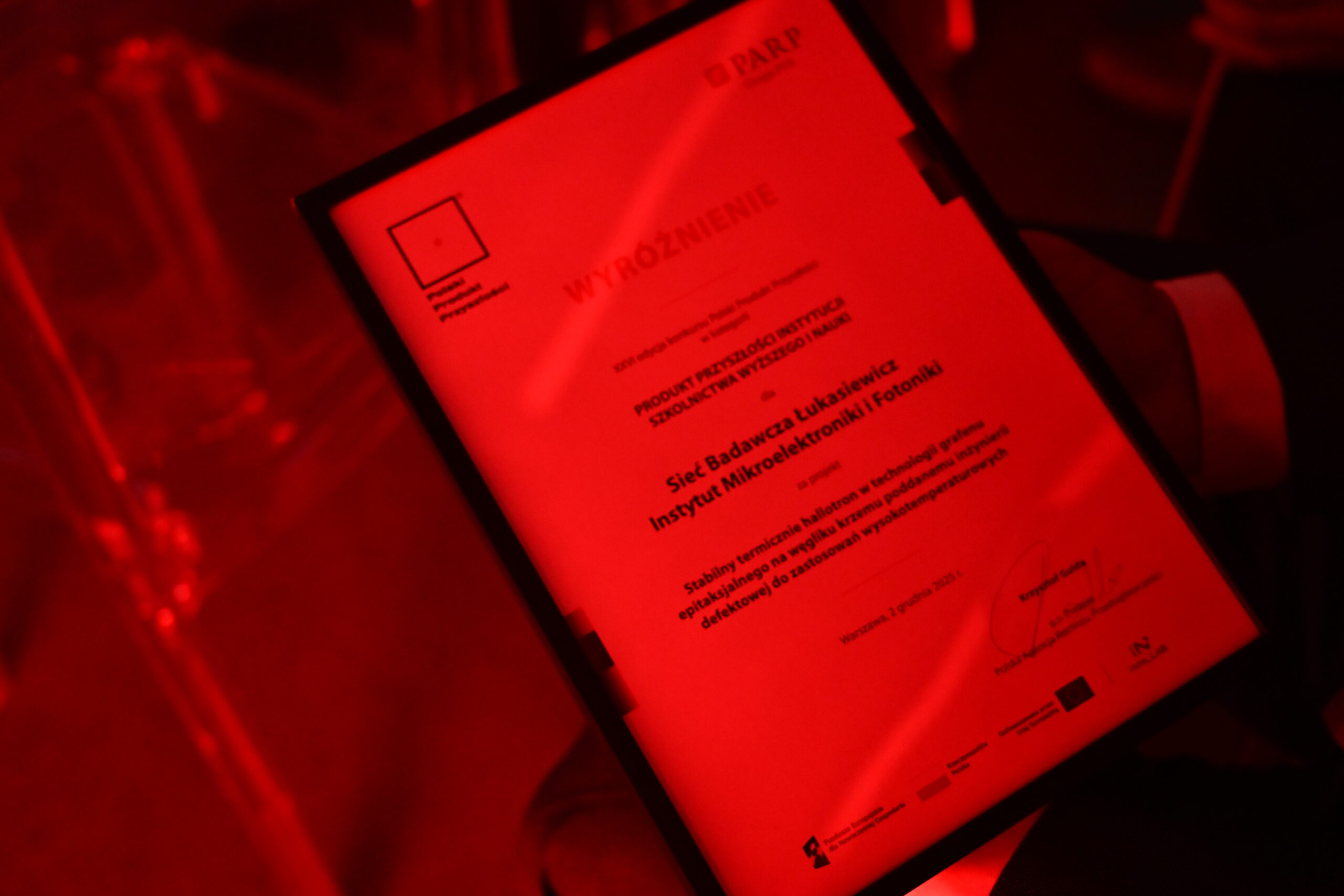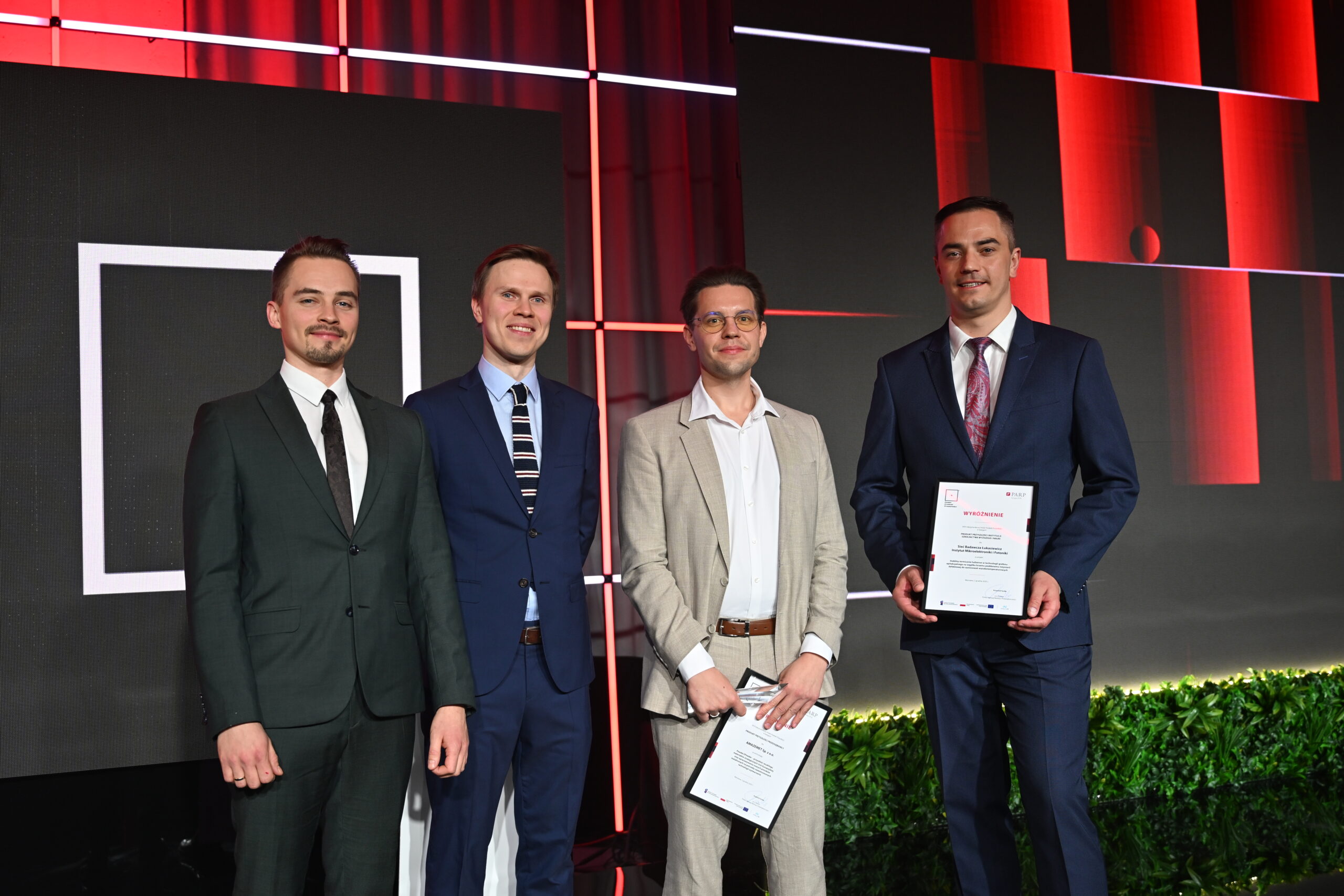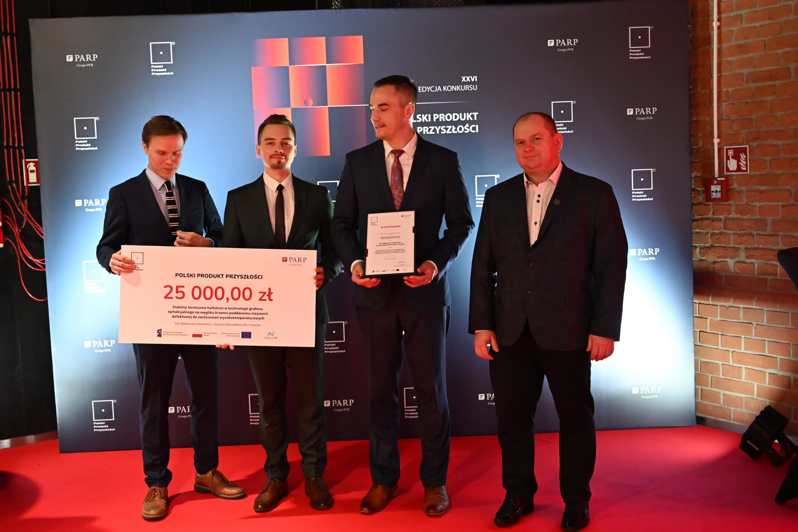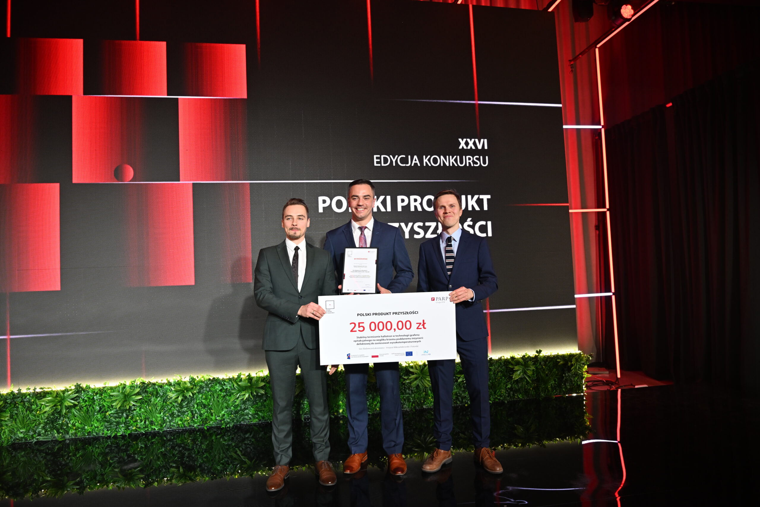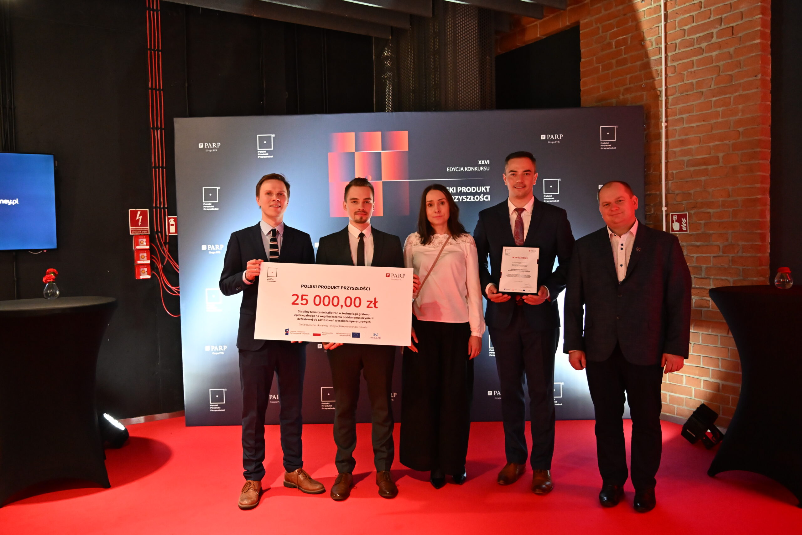Podczas Gali Finałowej XXVI edycji konkursu “Polski Produkt Przyszłości” organizowanego przez Polską Agencję Rozwoju Przedsiębiorczości (PARP), Łukasiewicz – Instytut Mikroelektroniki i Fotoniki, wraz z innymi instytutami i przedsiębiorstwami, otrzymał prestiżowe wyróżnienie. Nagroda została przyznana za projekt Stabilny termicznie hallotron w technologii grafenu epitaksjalnego na węgliku krzemu poddanemu inżynierii defektowej do  zastosowań wysokotemperaturowych. Pośród laureatów znalazł się też Łukasiewicz – PIT i jego produkt: technologia wyoblania osiowo niesymetrycznego blach. W tym samym konkursie, główną nagrodę w kategorii „Produkt przyszłości instytucji szkolnictwa wyższego i nauki” zdobył ŁukasiewiczInstytut Lotnictwa za innowacyjny silnik GRACE, odpowiadający na rosnące potrzeby sektora kosmicznego. To dowód na wyjątkowy wkład Instytutów w rozwój technologii, które kształtują przyszłość polskiej gospodarki i technologii na skalę międzynarodową!