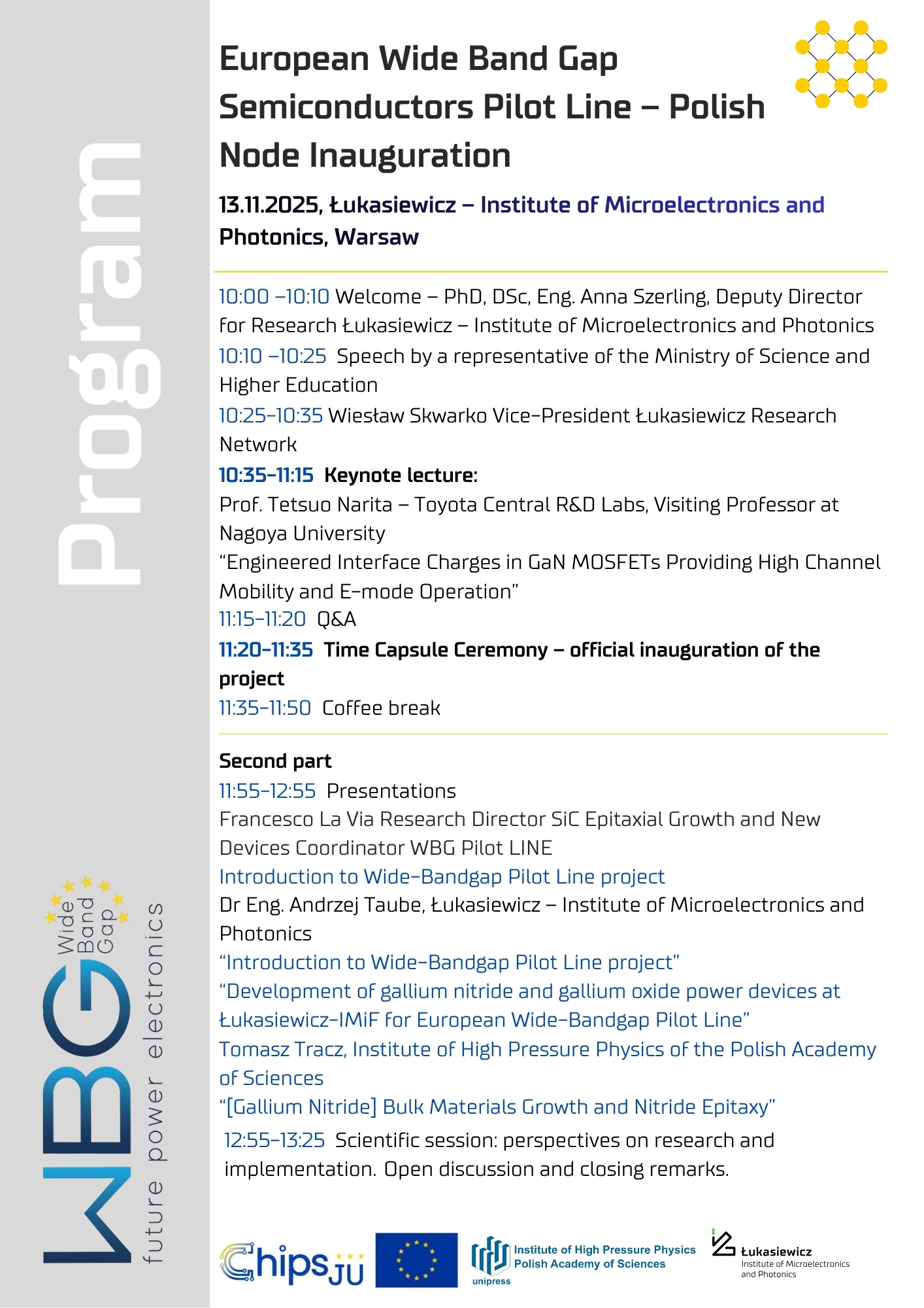 The pilot line constitutes the development of innovative material and instrument technologies based on wide bandgap semiconductors such as gallium nitride (GaN), aluminum nitride (AlN), silicon carbide (SiC), and gallium oxide (Ga2O3). The Polish research and development units, Łukasiewicz – IMiF and IWC PAN, will be responsible for developing techniques for the growth of GaN substrates and epitaxial layers, as well as GaN and Ga2O3-based device manufacturing technologies.