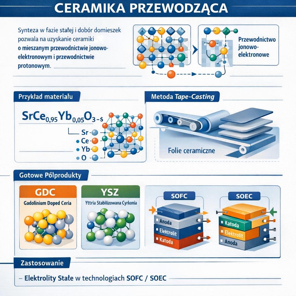 Instytut dysponuje dużym doświadczeniem w otrzymywaniu materiałów ceramicznych poprzez syntezę w fazie stałej. Dobór odpowiedniego składu i domieszek pozwala na uzyskanie ceramiki o pożądanych parametrach, wykazującej mieszane przewodnictwo jonowo-elektronowe oraz przewodnictwo protonowe. W procesie wytwarzania folii ceramicznych metodą tape-castingu wykorzystywane są również gotowe półprodukty, takie jak GDC (Gadolinium-Doped Ceria) oraz YSZ (Yttria Stabilized Zirconia). Pozwala to na uzyskanie wysokiej jakości elektrolitów stałych, które znajdują zastosowanie w technologiach SOFC/SOEC.