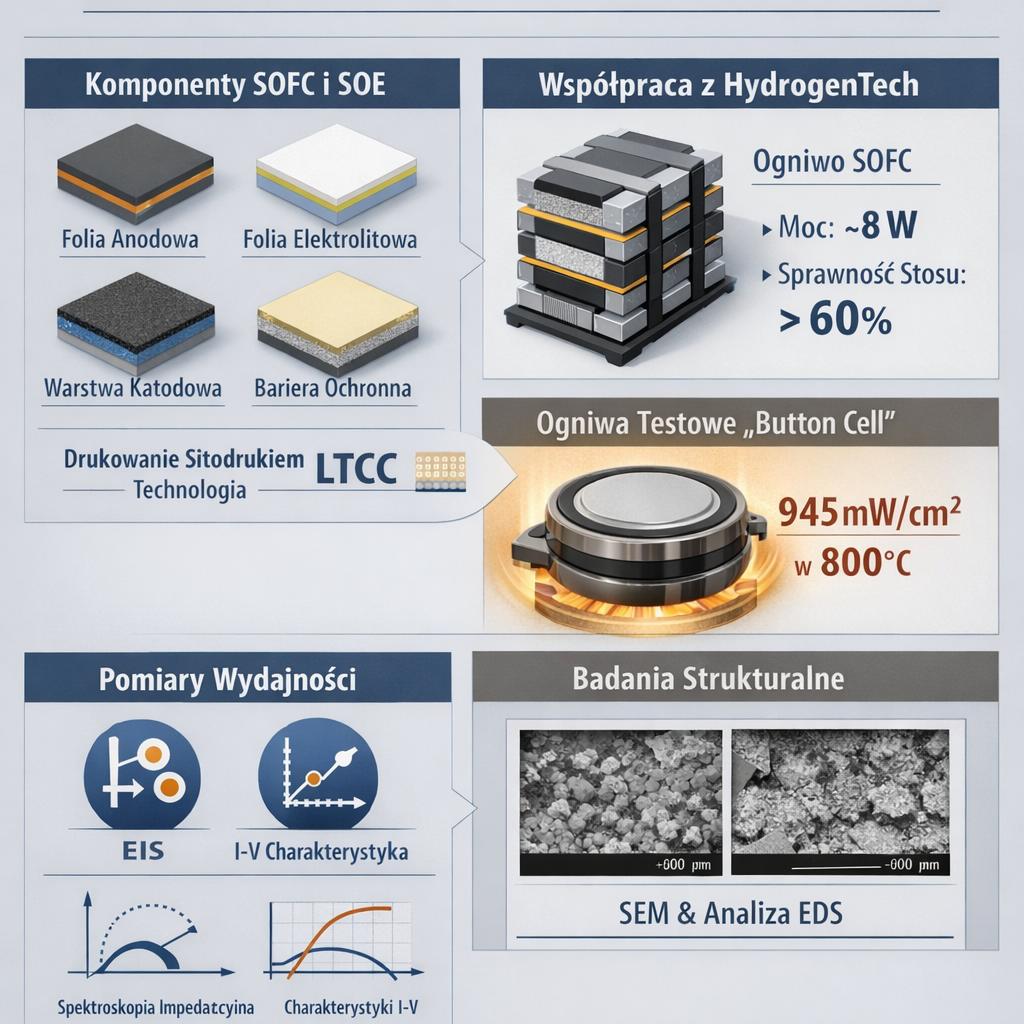 Grupa badawcza posiada specjalistyczne zaplecze i know-how w obszarze wytwarzania komponentów dla ogniw paliwowych SOFC oraz elektrolizerów stałotlenkowych. W ramach technologii LTCC realizowane są folie anodowe oraz elektrolitowe, a także procesy nanoszenia warstw barierowych i katod metodą sitodruku. Współpraca komercyjna (m.in. z firmą HydrogenTech) pozwoliła na opracowanie ogniw, z których pojedynczy element generuje ok. 8W mocy, przy sprawności stosu mogącej przekraczać 60%.