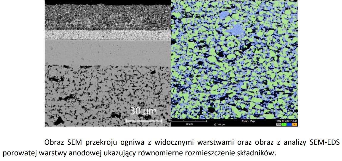 W warunkach laboratoryjnych opracowano ogniwa testowe typu button cell, które osiągały najwyższe wartości gęstości mocy na poziomie 945 mW/cm² w temperaturze 800°C. Pomiary wydajności obejmują elektrochemiczną spektroskopię impedancyjną (EIS) oraz charakterystyki prądowo-napięciowe (I-V). Wysoką jakość i poprawną integrację warstw oraz równomierne rozłożenie składników anody potwierdzają badania strukturalne z wykorzystaniem skaningowej mikroskopii elektronicznej (SEM) oraz analizy SEM-EDS.